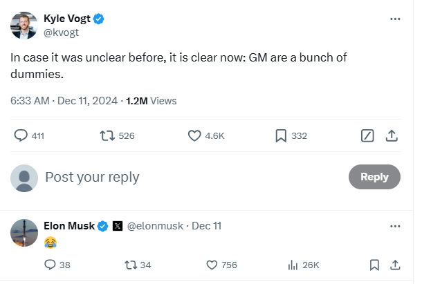 After the news broke, it caused an uproar in the following days. Former Cruise co-founder and CEO Kyle Vogt even directly commented on the social platform, "If it wasn't clear before, it is now clear: General Motors is a bunch of fools," and even Musk came to the comment section to watch the meal.