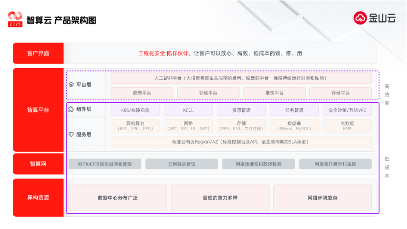 生成式AI技术不断成熟,应用场景也在持续拓展。金山云将围绕数据平台、训练平台、推理平台及存储平台进行智算平台整体能力建设,为大模型客户提供完整生命周期内易用、稳定的平台,保障持其持续运行时间和性能。