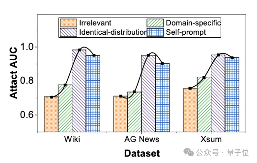 此外,本文探究了基于校正的成员推理攻击方法如何依赖于校正数据集的质量,并评估我们提出的方法是否能构建出高质量的校正数据集。本实验评估了在同分布、同领域、不相关数据集和通过自提示机制构建的数据集上,基于校正的成员推理攻击性能。实验结果表明提出的自提示机制可以构建出近似于同分布的高质量数据集。