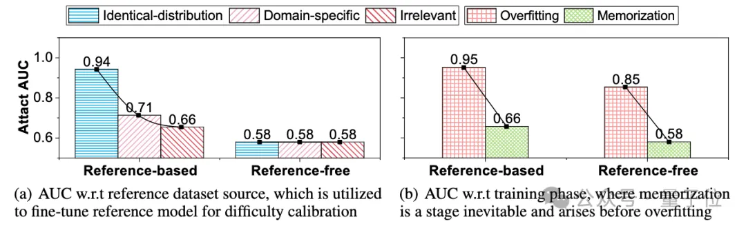 然而,现有的两种成员推理攻击范式依赖于两个在现实场景中无法成立的假设:1)可以获得与训练集具有相同数据分布的校正数据集,2)目标大型语言模型存在过拟合现象。 如下图 (a)所示,我们分别使用与目标模型训练集同分布、同领域、不相关的三个不同的校正数据集用于微调校正模型。 无校正的攻击性能始终较低,并且与数据集来源无关。对于基于校正的攻击,随着校正数据集与目标数据集之间相似性的下降,攻击性能呈现出灾难性地下降。如下图(b)所示,现有的两种攻击范式都仅能在呈现出过拟合现象的大模型中取得良好的攻击性能。因此,现有的范式在现实场景中只能取得接近于随机猜测的鉴别性能。