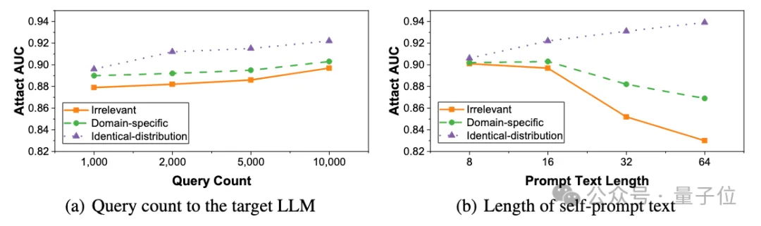 在现实世界中,攻击者可用的自提示文本来源通常受到实际部署环境的限制,有时甚至无法获取特定领域的文本。并且自提示文本的规模通常受限于 大模型 API 的访问频率上限和可用自提示文本的数量。为了进一步探究SPV-MIA在复杂的实际场景下的鲁棒性,本文从自提示文本来源,尺度,长度三个角度探究在极端情况下的成员推理攻击性能。