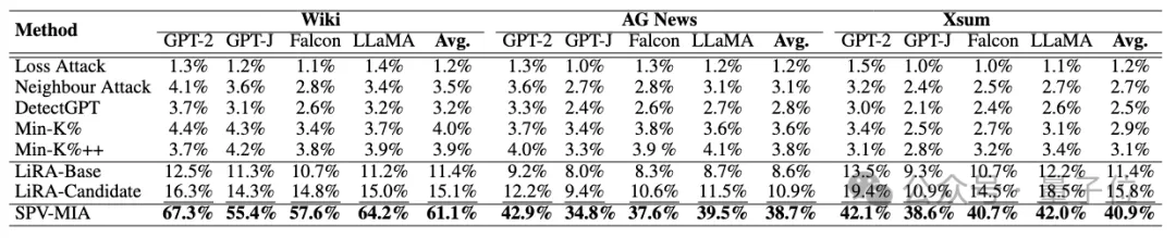 为了评估攻击算法SPV-MIA的有效性,本研究在四个开源的大模型GPT-2,GPT-J,Falcon-7B,LLaMA-7B和三个不同领域的微调数据集Wikitext-103, AG News, XSum上进行实验评估。