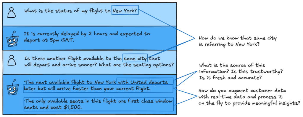 For example, AI-based travel assistants using stream processing can automatically monitor flight schedules, identify delays, rebook affected flights, and notify users, all without human intervention. With static data that is updated in batches, this level of autonomy is not possible.