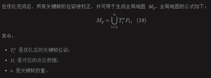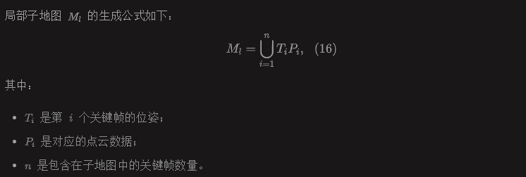 On the back end, we build local submaps based on keyframe aggregation. Keyframes are selected LiDAR scan frames that adequately represent the motion state of the vehicle in the environment. When generating local submaps, the overlap rate between key frames needs to reach a preset threshold to ensure that each submap can contain sufficient environmental features.