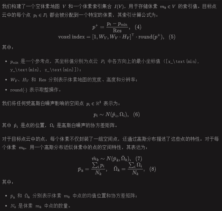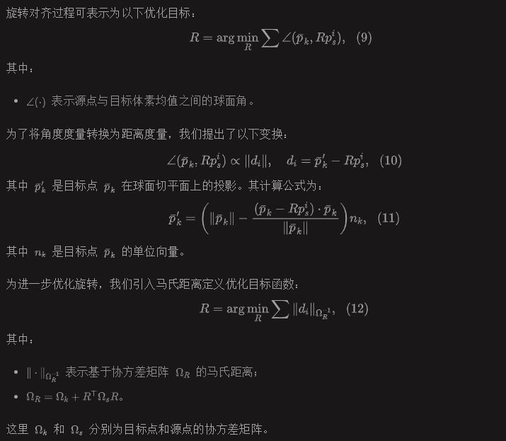 Through the matching process, we get the correspondence between the source point and the target voxel C. Next, the rotation between scans is calculated by aligning the points in the source point cloud with the Gaussian distribution mean Pk in the target voxel. The rotational registration model is shown in Figure 5.
