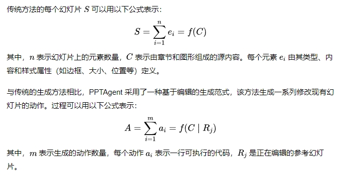 Look at a PPT generation idea: PPTAgent. Traditional PPT generation methods usually use the end-to-end text generation paradigm, which only focuses on the text content, ignoring the layout design and PPT structure. PPTAgent uses an edit-based generative paradigm to address the challenges of dealing with spatial relationships and design style.